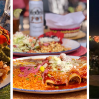 Cheese, chicken, and pork enchiladas with three-cheese sauce.